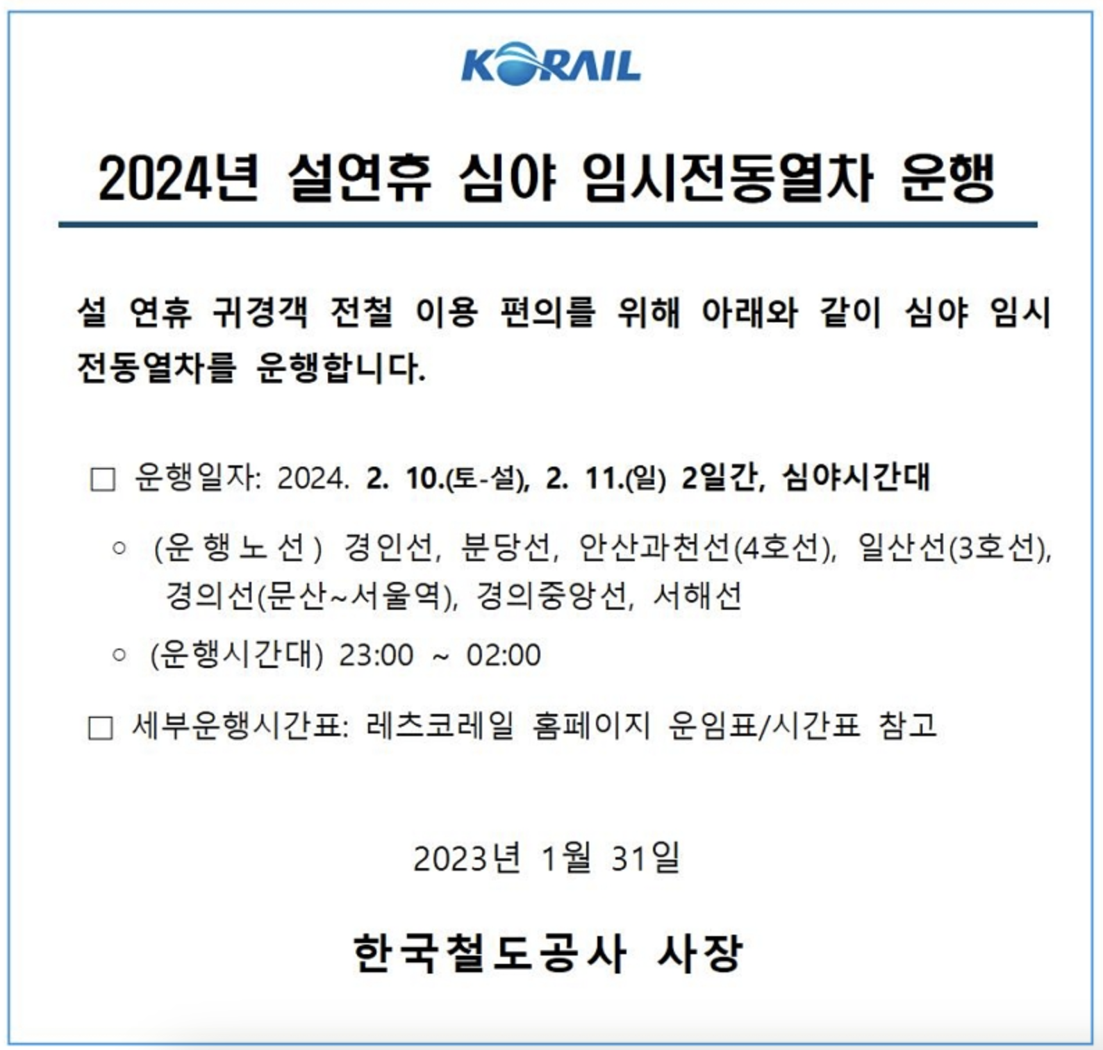 심야 임시전동연차를 아래와 같이 운행 예정에 있으며 설 연휴 기간에는 특송 서비스가 제공되지 않습니다.