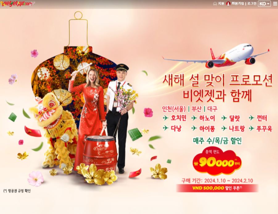 또한 베트남 항공사인 비엣젯에서는 기본운임이 9만 원부터인 특가 항공권 프로모션을 진행 중입니다. 프로모션 날짜와 시간은 2024년 2월 10일까지 매주 수요일, 목요일, 금요일에 00시부터 24시까지 진행됩니다. 비엣젯 사이트와 어플에서 구매하실 수 있습니다.